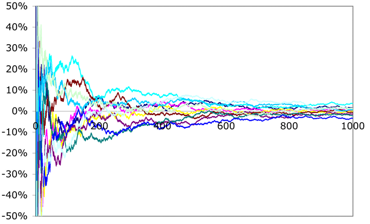 This is multiple simulated result of a coin tosses stacked together displaying how normal distribution looks like. The results tends to fall within an area, but there are a lot of noise, it is not a very stable, smooth line. In this post, we will learn about the power of deviation.