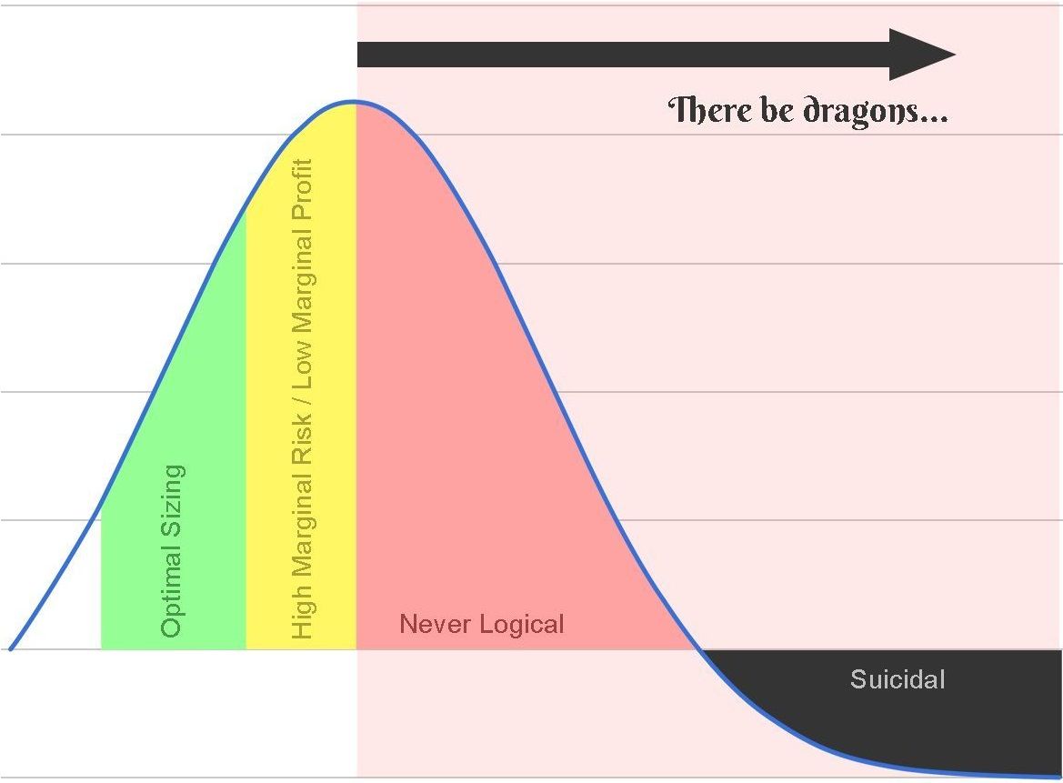Red area shown above is well labeled, it is never logical to risk that high. Why? because you could achieve the same value with lower risk, it's plain silly to risk more than the peak of curve, and the drawdown ahead would be huge. (crushingly huge)